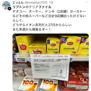 という情報も。配布状況は店舗ごとに異なるため、リプトン紅茶コーナーのポップを直接チェックするのが確実です。