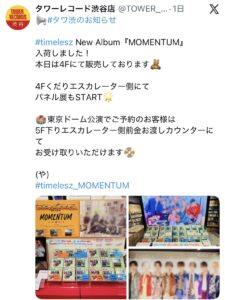 timelesz(タイムレス) のアルバム『MOMENTUM』の発売を記念して渋谷のタワーレコード・TSUTAYA・HMVでは特大パネルやポスターなどが展示されています。